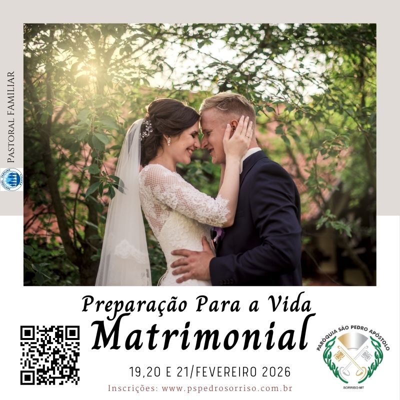 A Paróquia São Pedro Apóstolo, em Sorriso/MT, convida todos os casais para o Encontro de Preparação para a Vida Matrimonial, nos dias 19 a 21 fevereiro de 2026.