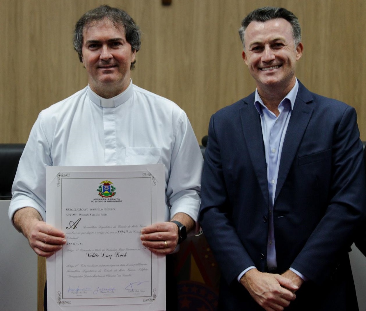 Na noite da última terça-feira, 27 de maio, a comunidade paroquial da Igreja Matriz São Pedro Apóstolo, em Sorriso (MT), teve a alegria de testemunhar um momento de grande reconhecimento. Nosso pároco, Pe. Valdir Luiz Koch, recebeu o Título de Cidadão Mato-grossense, uma honraria concedida pela Assembleia Legislativa do Estado de Mato Grosso, por meio do deputado estadual Xuxu Dal Molin (União).